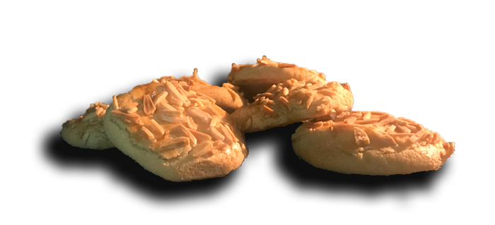 Masa dulce horneada, de textura seca, color amarillo tostado y forma ovalada con almendra.